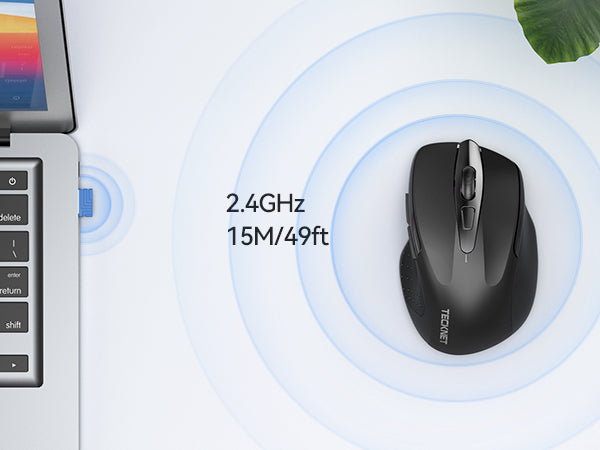 Tiny USB receiver can plugs conveniently into your computer's USB port and takes up minimal space. No drivers need to be installed. 2.4GHz wireless transmission technology provides a powerful and reliable connection up to 49ft.