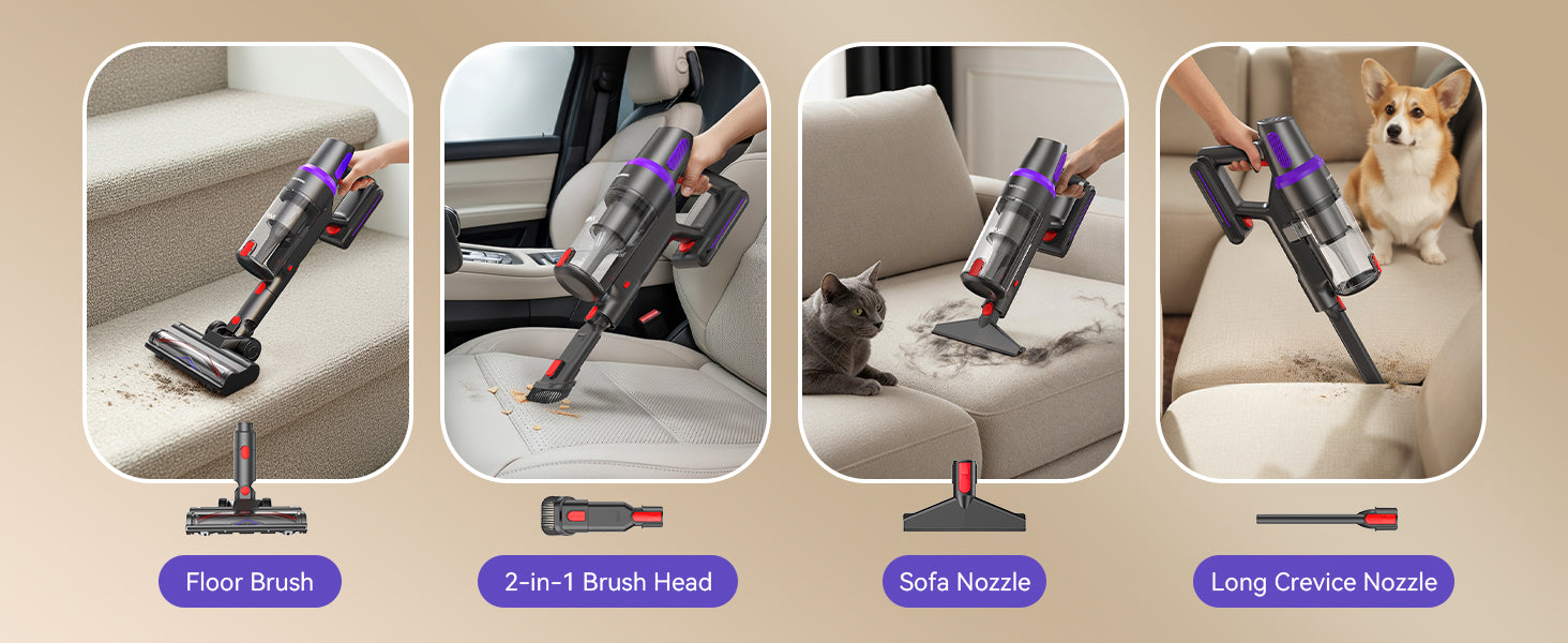 HEPA Filter Replacement x3; Rechargeable Storage Mount x1; Floor Brush x1; 2-in-1 Crevice Brush x1; Flat Head Brush x1; Adjustable Telescopic Tube x1; Hair Clean Brush x1; Charging Adapter x1; User Manual x1