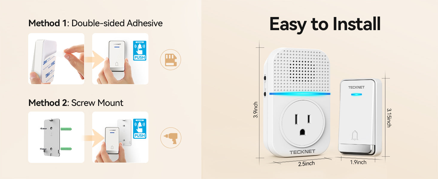 Wireless doorbells kits with 60 CD-quality chime tunes and 5-level adjustable volume from 65dB to 90dB, tecknet door bell with 2 receivers suitable for large houses or apartments and hearing impaired.