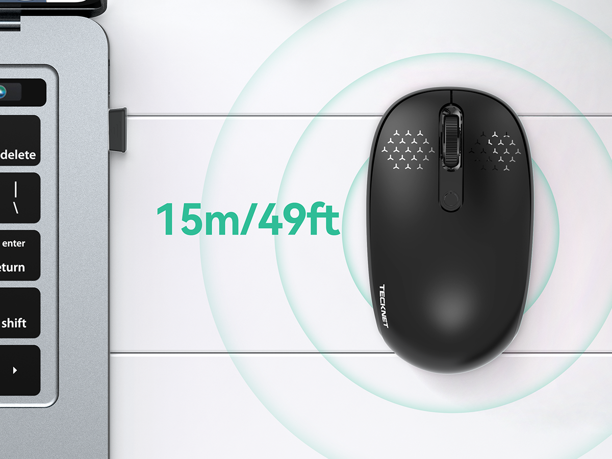 TECKNET travel mouse comes with a nano receiver (stored in the mouse). 2.4GHz wireless technology ensure reliable connectivity, working distance up to 49ft. 3 adjustable DPI levels (1600-1200-800) to meet your different needs.