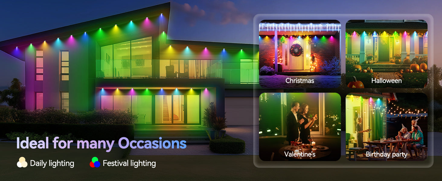 Preset/DIY Modes, Dual Music Sync, IP67 Waterproof Outdoor Lighting for Holiday & Party Decorations