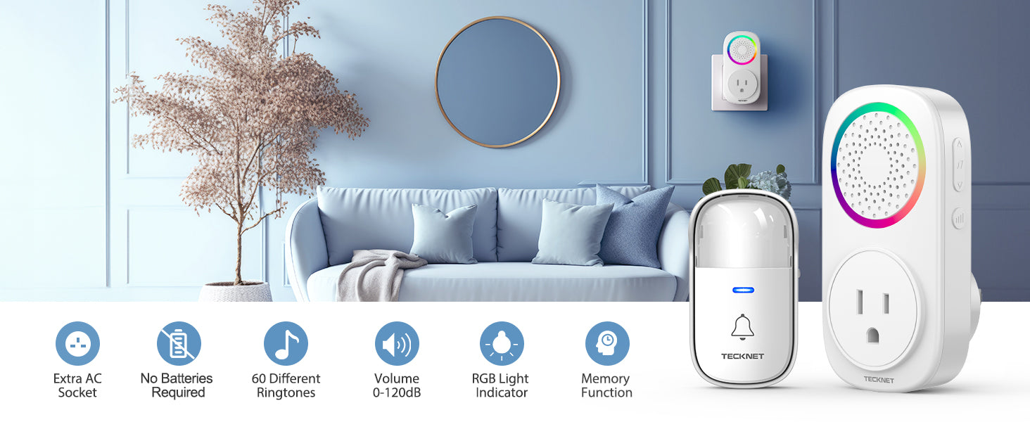 TECKNET Self-Powered Wireless Doorbell Kit - Plug-Through Door Bell with RGB Light