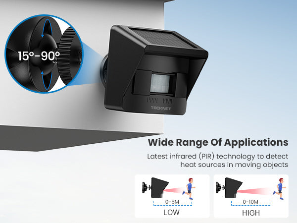 The motion sensor utilizes state-of-the-art pyroelectric infrared (PIR) technology to detect heat from moving objects. Its rotating bracket allows precise adjustment of the sensor’s focus and detection angle, with two sensitivity levels:(Low: 16 ft,High: 33 ft) alarm signals transmit up to 1/2 mile, ensuring instant motion alerts when a person, vehicle, or animal enters your monitored area (e.g., front door, driveway, or backyard).