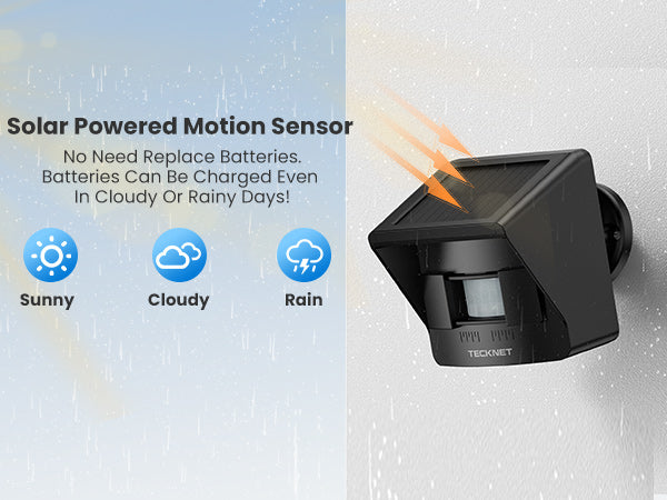 The motion detector is powered by a battery that is charged by solar energy,eliminating the need to replace batteries and can be recharged by the solar panel even on cloudy or rainy days, reducing additional electricity costs.