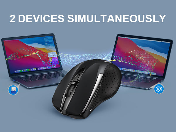 Connect two devices simultaneously using either Bluetooth(3.0/5.0) or USB A connection for a wireless mouse experience. Seamlessly switch between the connected devices with a simple slide of the switch button. This makes it an ideal choice for those seeking both a usb mouse and a bluetooth mouse.