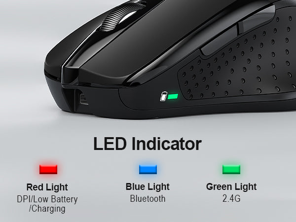 The wireless mouse has indicator lights in different colors to show Bluetooth connection status and battery level, providing clear visual feedback for a seamless user experience.