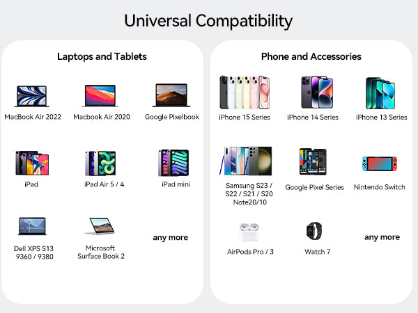 The type c charging block is compatible with iPhone 15 Pro Max/ 15 Plus/ 15 Pro/ 15/14/13/12, MagSafe, iPad Pro, Galaxy Z Flip 4/ S23/ S22 Ultra/ S22/ S21/ S20/ Note 20/ Note 20 Ultra/ Note 10+, Google Pixel 7 Pro/ 6a/ 5/ Nintendo Switch and more electronic devices (USB-C CABLE NOT INCLUDED).
