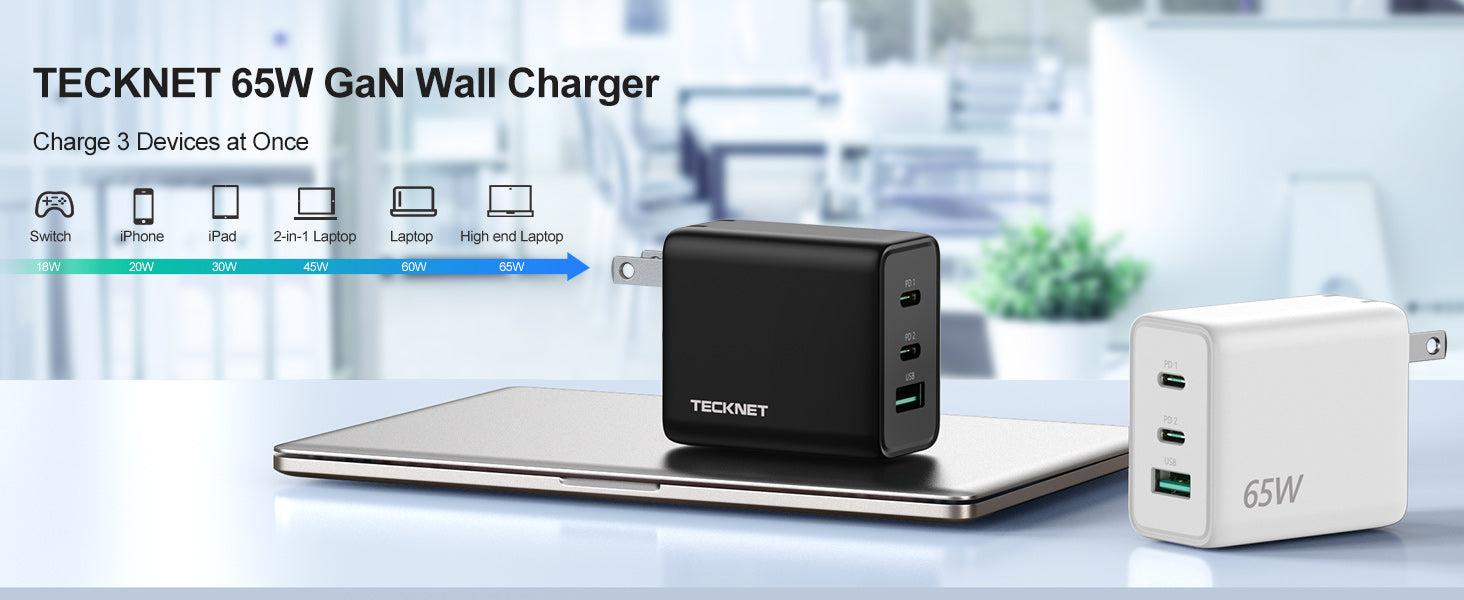 TECKNET 65W 3-Port USB C GaN Fast Charger