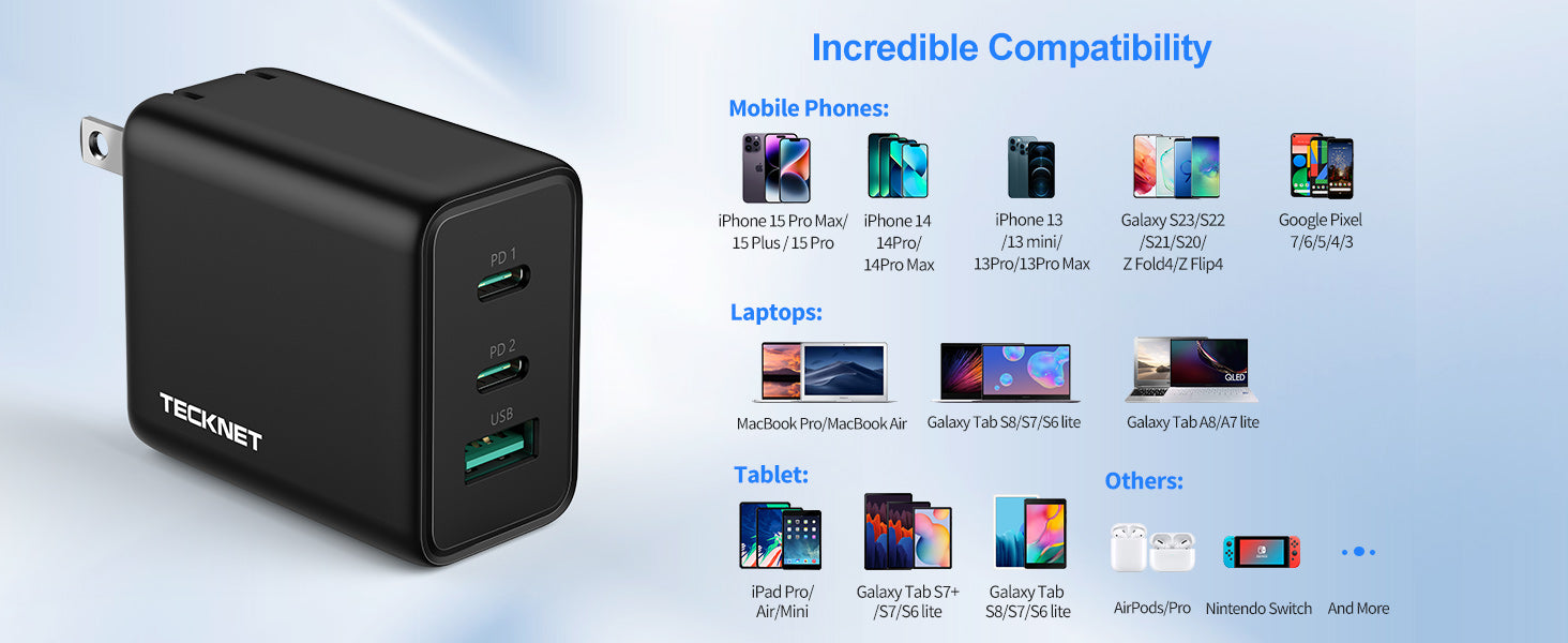TECKNET utilizes the industry-leading GaN Chip to better power, operates up to 100x faster than old, slower silicon semiconductors, delivering 3x faster charging.