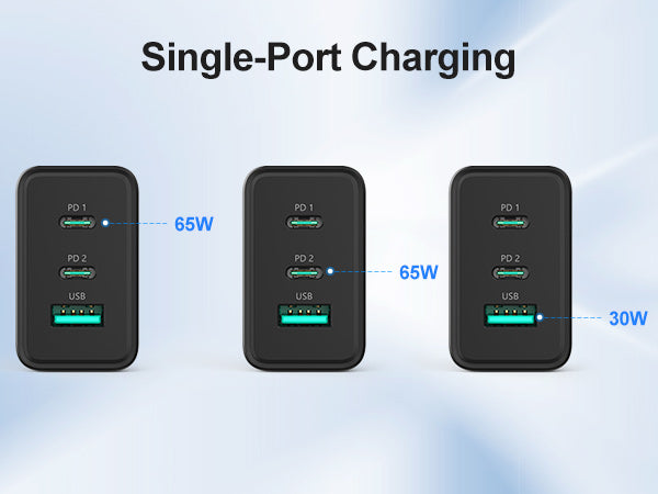 This 65W USB-C wall charger features three ports that allow for simultaneous fast charging of multiple devices, including smartphones, tablets, and laptops up to 65W. Equipped with advanced GaN technology, the charger is more compact, lightweight, and efficient, reducing heat and power consumption for a reliable charging.