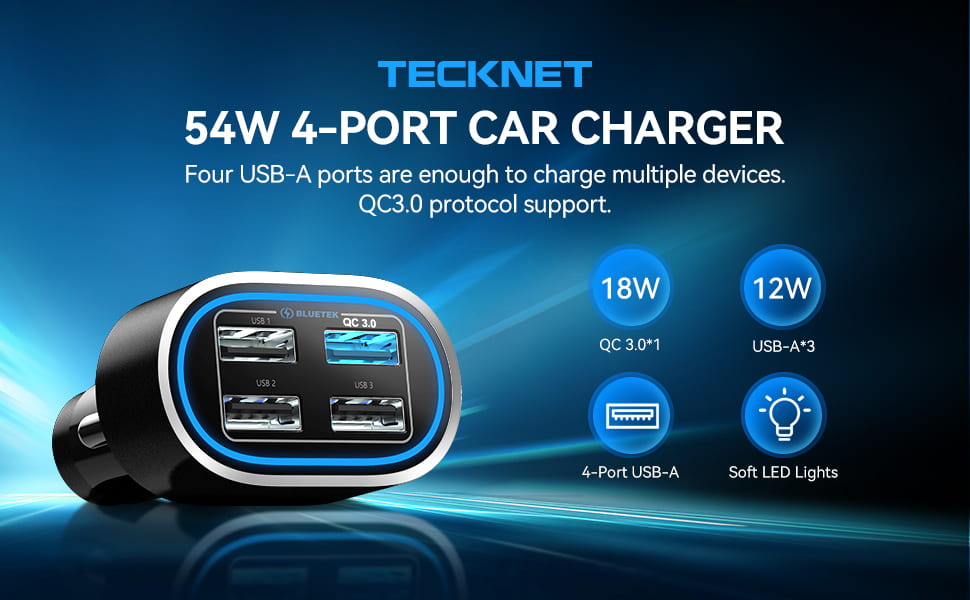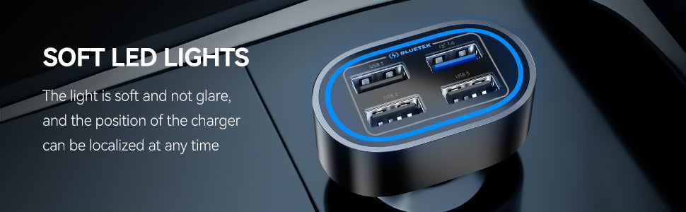 Upgraded 54W USB Car Charger provides you with a fast-charging experience, the soft LED light makes It easy to find at night.