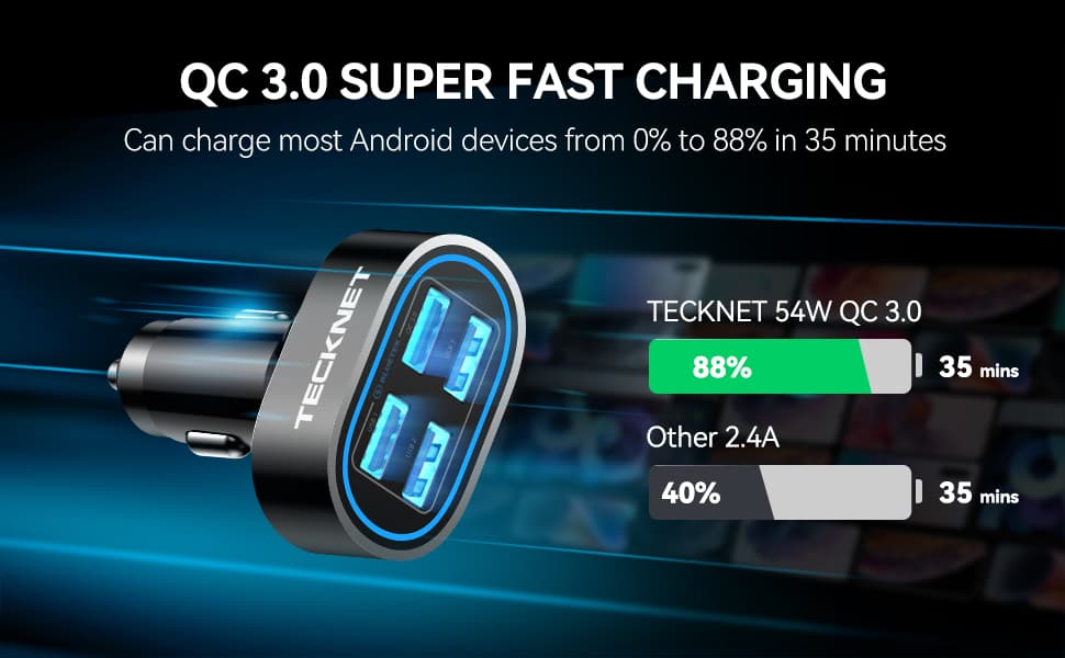 The USB Car Charger is equipped with QC3.0 fast-charge ports with a maximum output of up to 54W in total (QC3.0 18W output and USB 1/2/3 12W output at each port). Support QC3.0/QC2.0/AFC/FCP protocol. They make a 2X faster-charging speed, saving an average of two hours with the QC3.0 port.