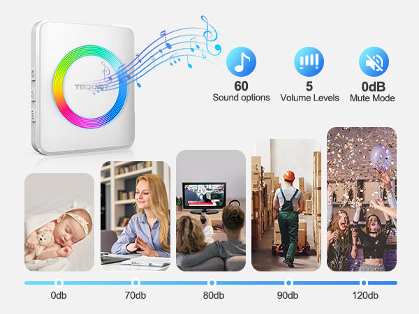 Easily choose from 60 melodies with memory function; 5 adjustable volume levels of 0-120 dB