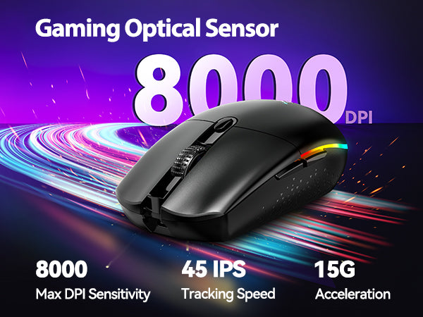 Enhance your setup with vibrant RGB lighting and 6 modes that sync with your DPI settings: 800 (red), 1600 (blue), 2400 (green), 3200 (yellow), 4800 (orange), and 8000 (purple). Choose dynamic effects for an immersive experience or turn off the lighting to save battery during long sessions.