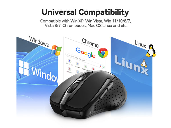 The USB mouse is compatible with Windows11,10,8.1,8,Vista 7,XP, Mac OS (Side buttons are not available), and Linux. Works with Notebook, Chromebook, PC, Laptop, Computer, and more. (batteries are NOT included)